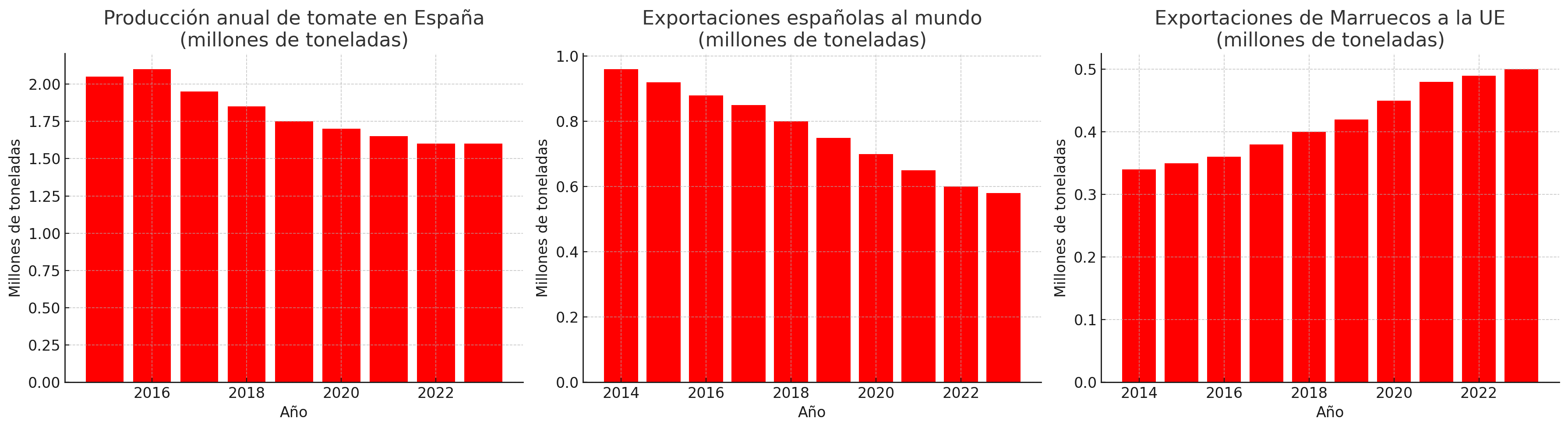 Según datos de 2023, España exportó un 38,7% menos de tomates en comparación con diez años atrás. Paralelamente, Marruecos ha pasado de exportar 345.416 toneladas en 2014 a 492.438 toneladas en 2023, consolidándose como el segundo mayor proveedor de la UE después de los Países Bajos. Este cambio ha supuesto un sorpasso histórico, con Marruecos superando a España por primera vez en volumen de exportación.